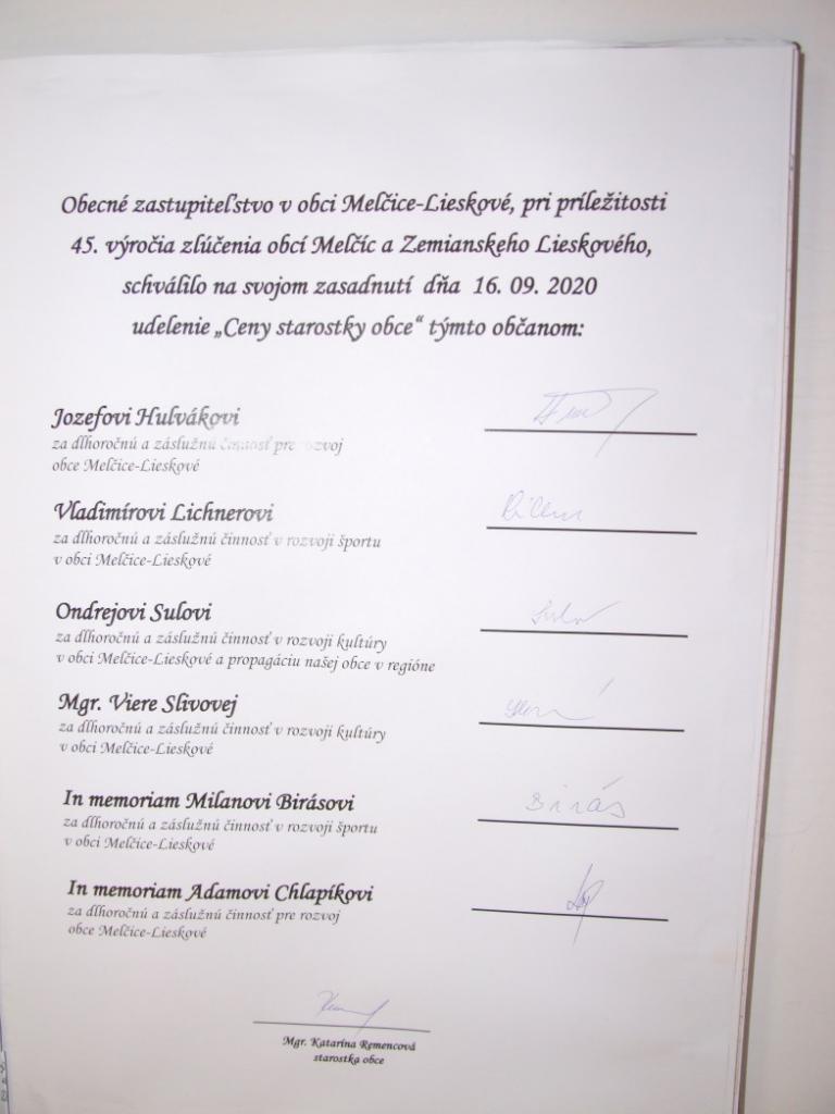 Obecné zastupiteľstvo v obci Melčice-Lieskové, pri príležitosti 45. výročia zlúčenia obcí Melčíc a Zemianskeho Lieskového, schválilo na svojom zasadnutí dňa 16. 09. 2020